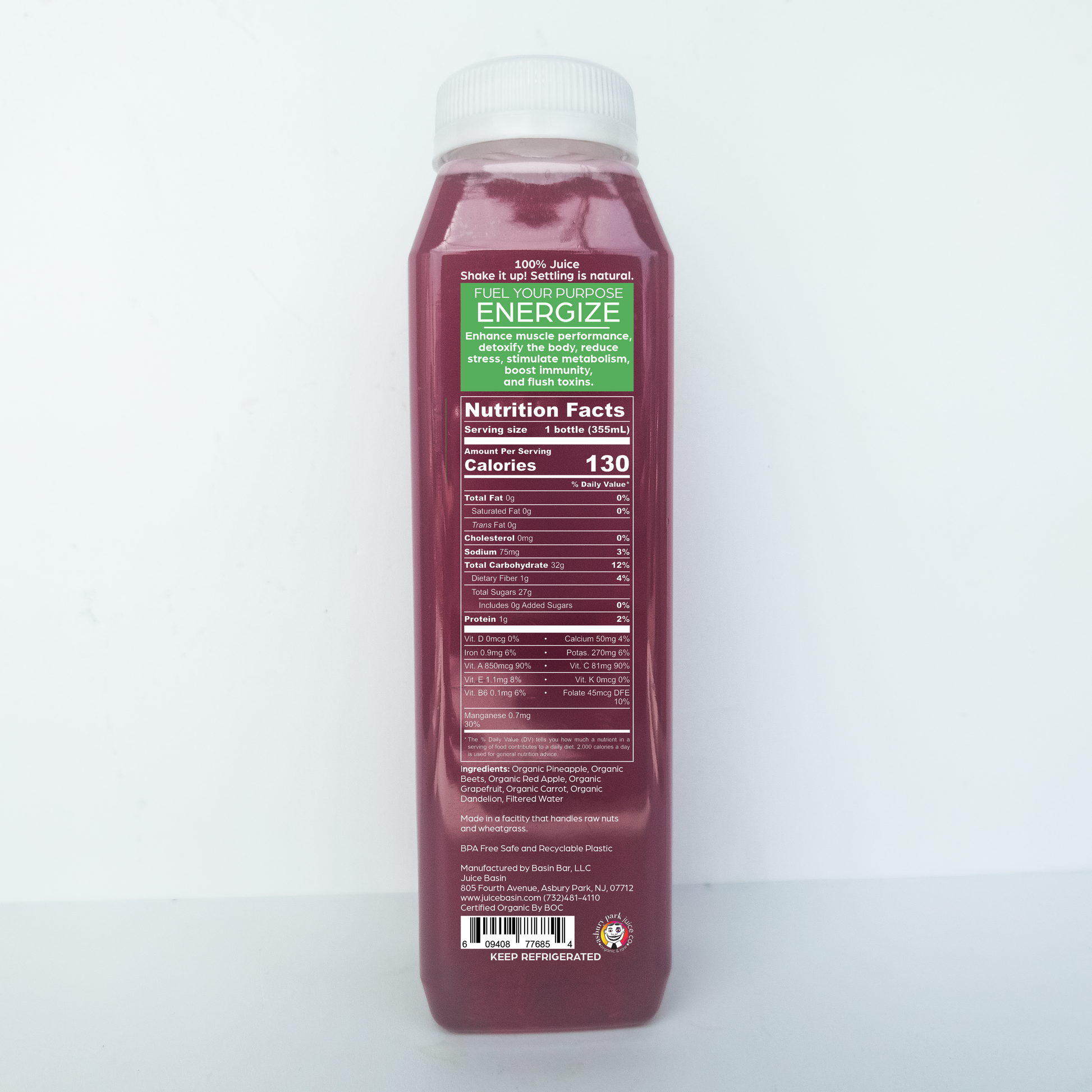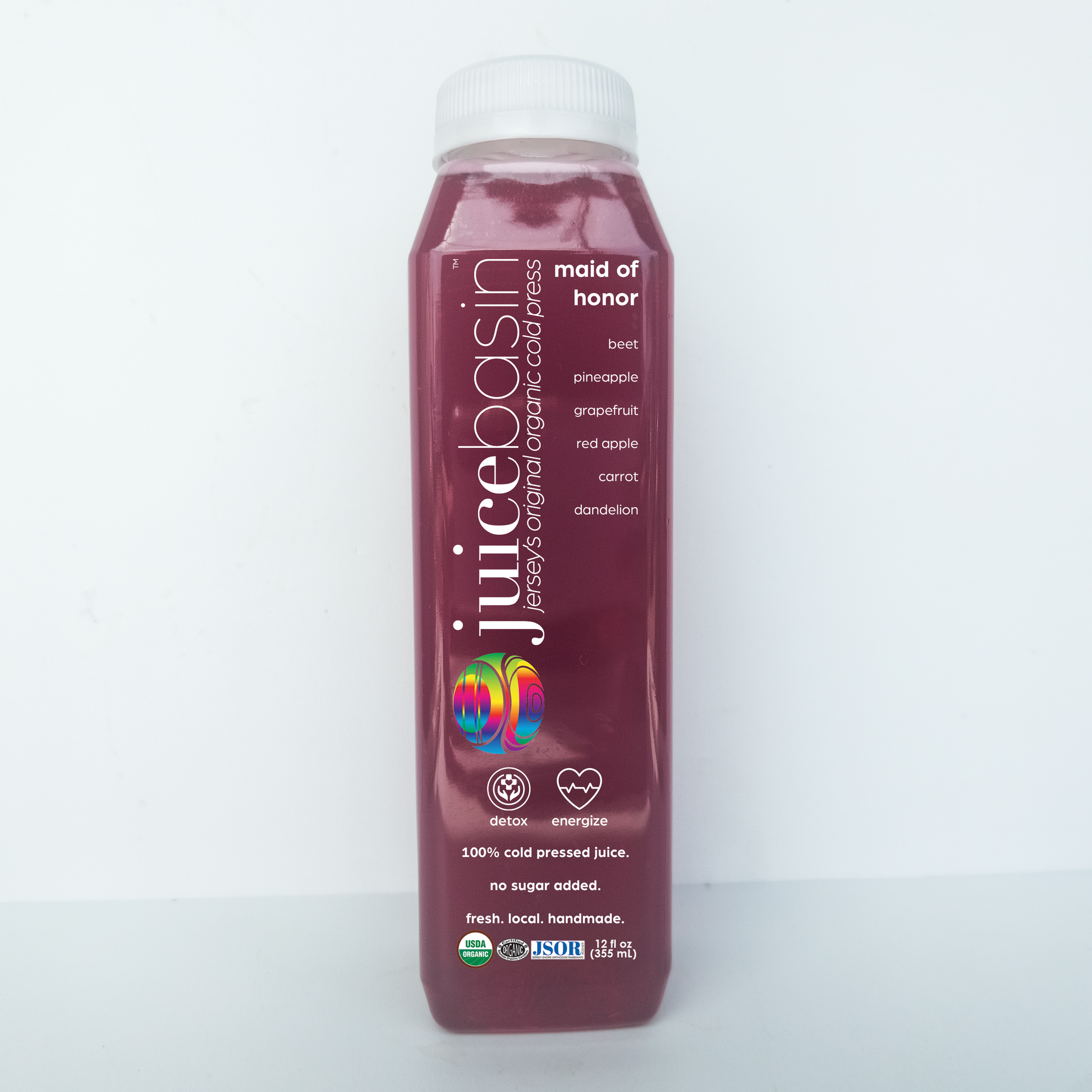 The fresh organic juice ingredients are: beet, pineapple, grapefruit, red apple, carrot, lemon and dandelion. The juice taste is robust. The purpose is detox and energize. The health benefits of beet juice are numerous. Handmade fresh in Asbury Park, NJ.